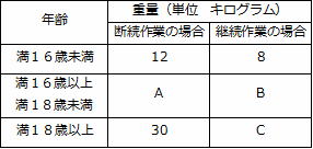 | 女性については、労働基準法に基づく危険有害業務の就業制限により次の表の左欄の年齢に応じ右欄の重量以上の重量物を取り扱う業務に就かせてはならないとされているが、同表に入れるAからCの数値の組合せとして、正しいものは(1)~(5)のうちどれか。 | ||||